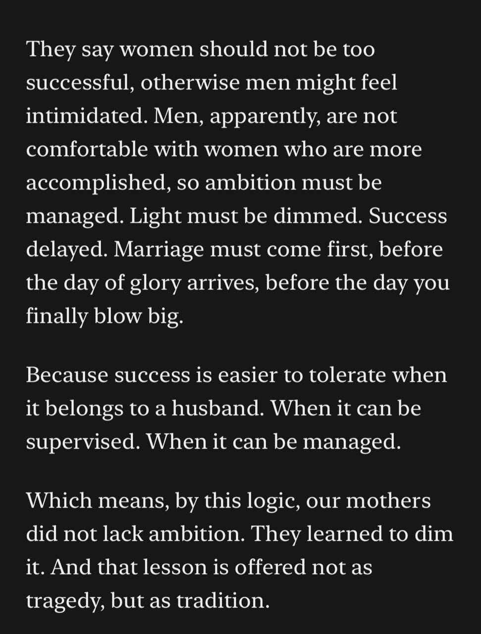Although access is still not widespread, the average educated woman today has more options than being confined to traditional expectations. She has more options than settling for a mediocre partner out of fear that she will not get another chance at happiness because she is unmarried. With enough confidence, she can even decide not to get married and still live a successful and fulfilling life.