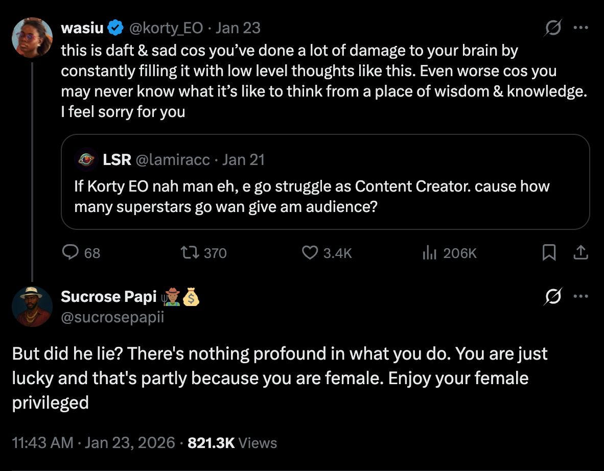 Korty EO is an accomplished content creator who I have admired for a long time for her work ethic and grit. So imagine my shock when I’m scrolling through X(twitter) and her hard work is begin discredited and her achievement being credited to her gender.